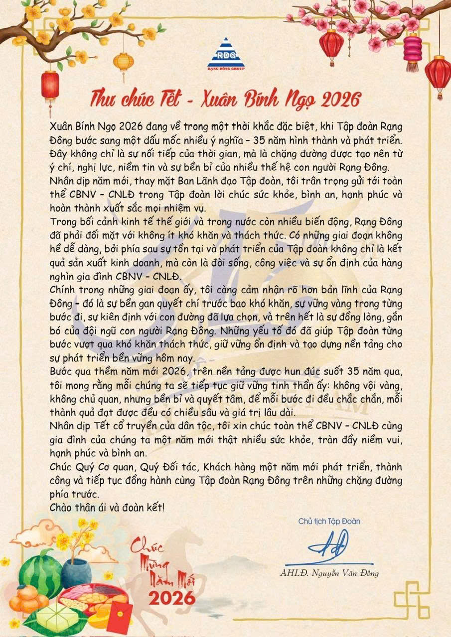 Xuân Bính Ngọ 2026 đang về trong một thời khắc đặc biệt, khi Tập đoàn Rạng Đông bước sang một dấu mốc nhiều ý nghĩa - 35 năm hình thành và phát triển.